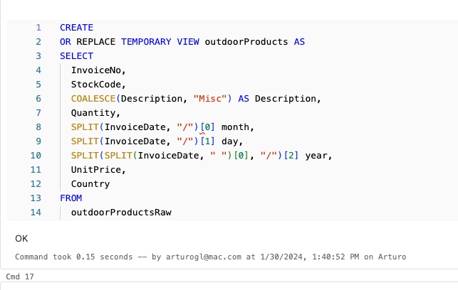 The third SPLIT is different. Remember that our InvoiceDate column is a string that includes a date and time. Each part of the date is seperated by a forward slash, but between the date and the time, there is only a space. Line 10 contains a nested SPLIT function that splits the string on a space delimiter.